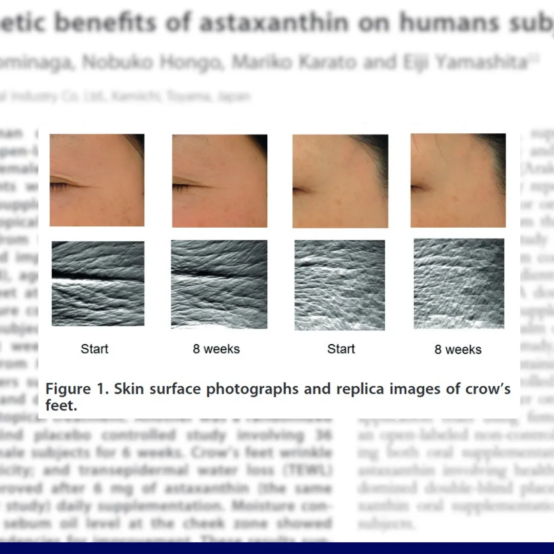 รายงานพบว่า : ทาน Astaxanthin วันละ 6 mg ช่วยให้ริ้วรอยรอบดวงตาลดลง ผิวมีความยืดหยุ่นดีขึ้นและช่วยลดการสูญเสียความชุ่มชื้นของผิว ทำให้ผิวดูอิ่มน้ำมากขึ้นได้จริง (อ้างอิง)
