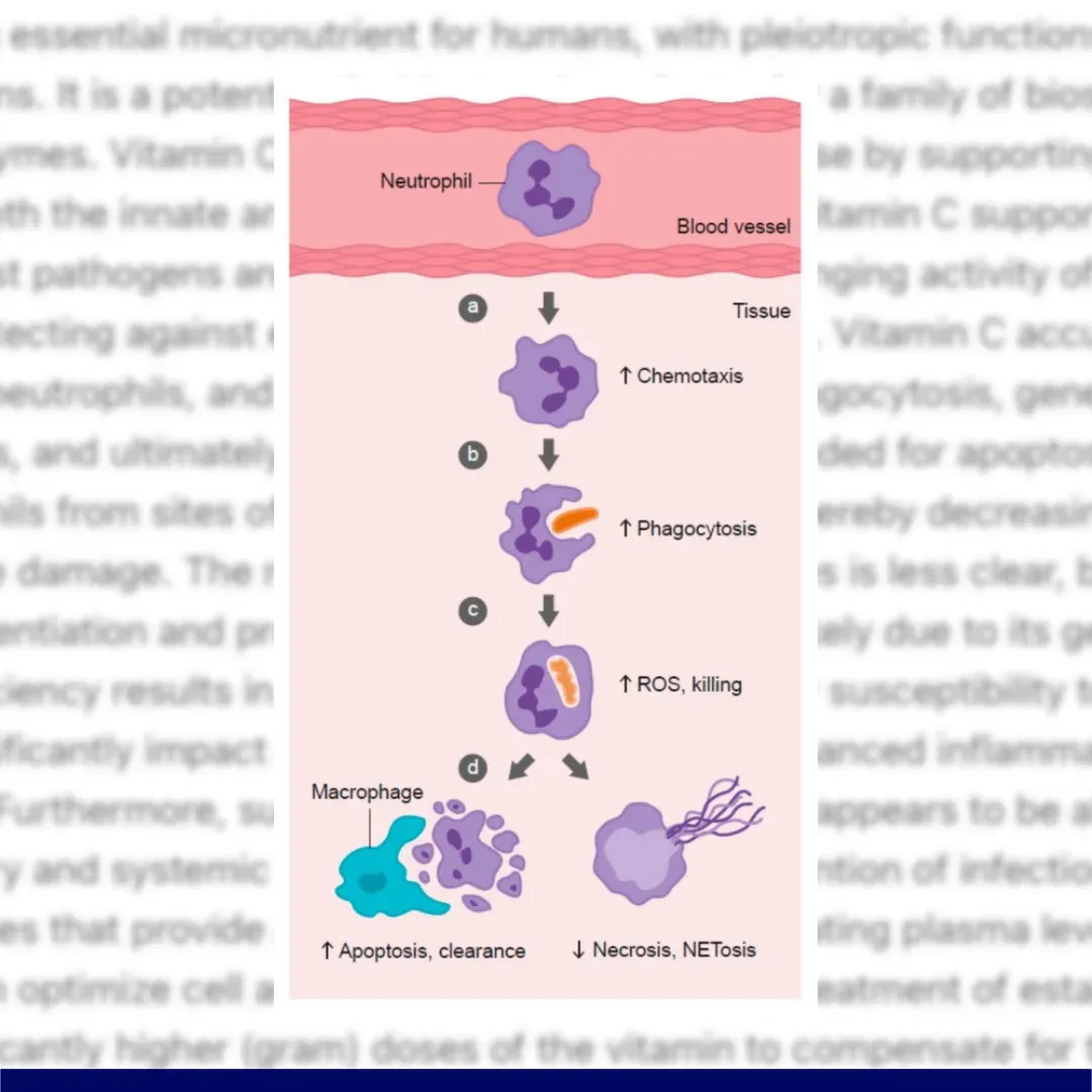 วิตามินซีช่วยให้ Neutrophils ทำลายเชื้อโรคได้ดีขึ้น โดยกระตุ้นกระบวนการทำลายแบคทีเรียและเชื้อก่อโรคภายในเซลล์ นอกจากนี้ยังช่วยควบคุมการตายของเซลล์อย่างเหมาะสม ลดการสะสมของเซลล์ที่เสื่อมและลดการอักเสบที่มากเกินไป ทำให้ภูมิคุ้มกันทำงานได้สมดุลขึ้น
