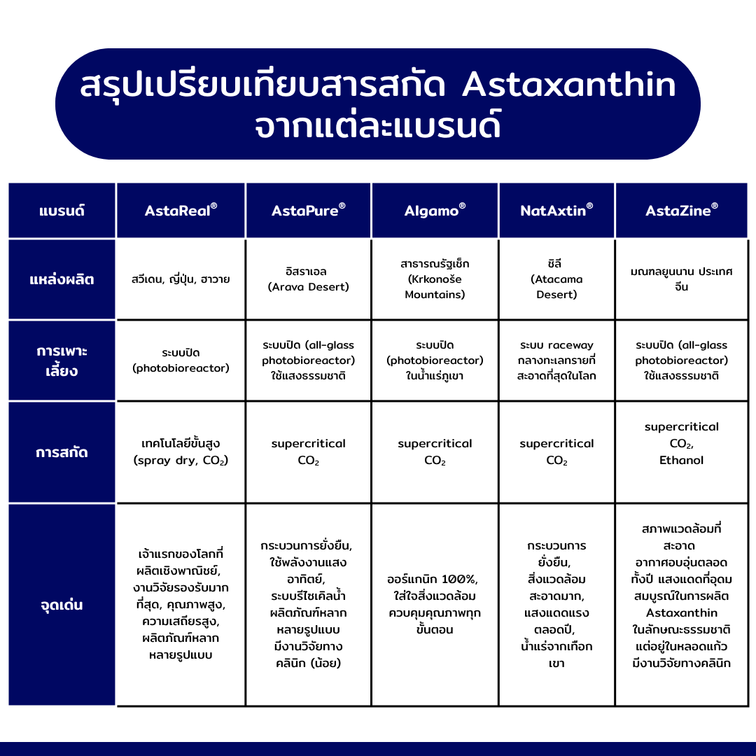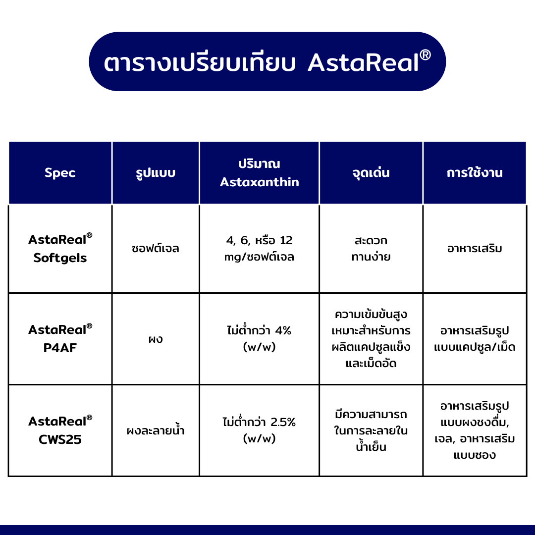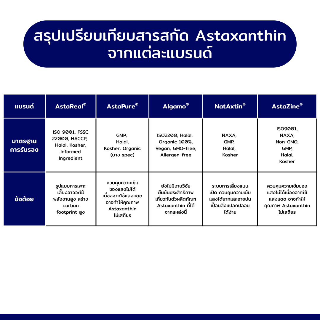 จุดเด่นของ AstaReal® คือ การควบคุมคุณภาพของสาร ตั้งแต่การเพาะเลี้ยง การสกัด ไปจนถึงงานวิจัยรองรับมากที่สุด และการันตีความเสถียรของสาร แต่ AstaReal® เอง เค้าก็มี Spec อีกเยอะ ขึ้นอยู่กับวิธีการสกัดและการนำไปใช้งาน ส่วนการเปรียบเทียบ AstaReal® แต่ละ Spec ที่มีตามท้องตลาดในตอนนี้