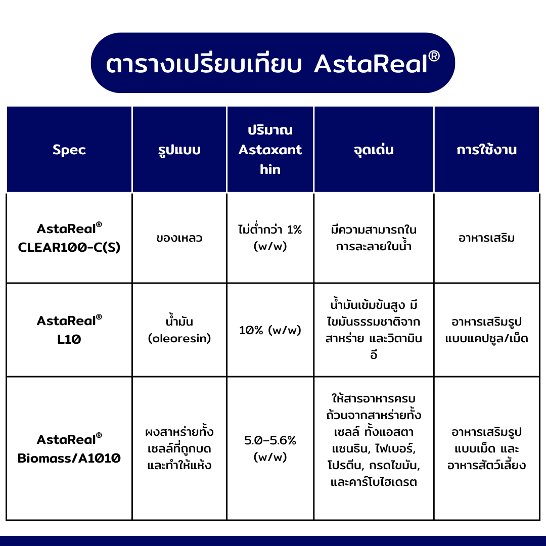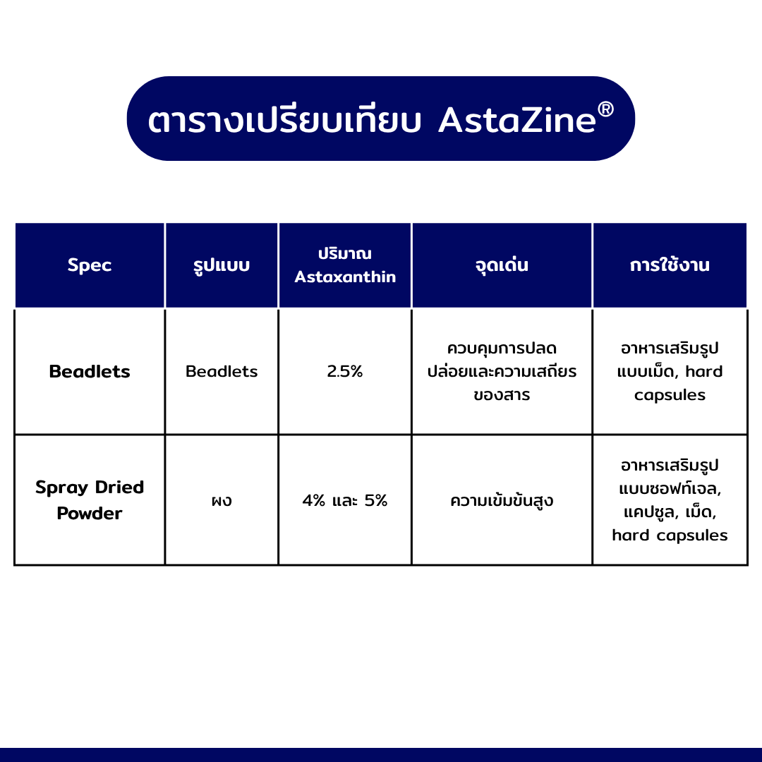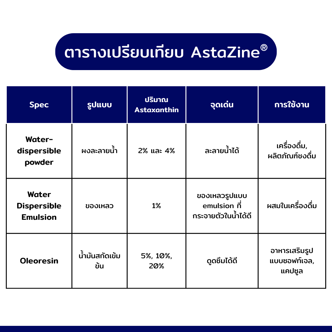 ซึ่ง Spec Astaxanthin แต่ละตัวของ AstaZine ก็เปรียบเทียบการนำไปใช้งานตามตารางนี้