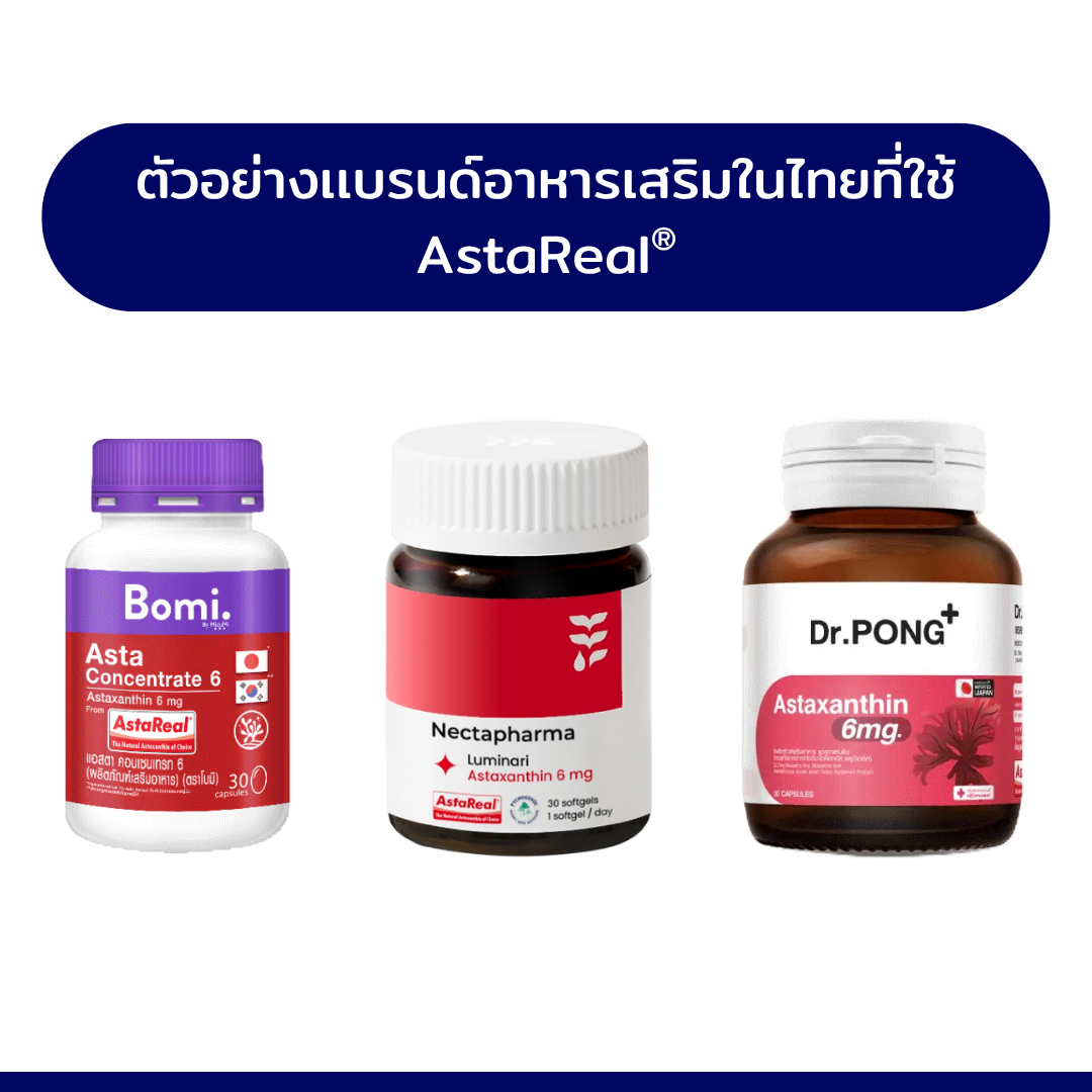 AstaReal® จุดเด่นของแบรนด์นี้คือเป็นเจ้าแรกของโลกที่ผลิตในเชิงพาณิชย์, มีงานวิจัยรองรับมากที่สุดซึ่งทำมานานกว่า 35 ปีและทำใน Clinical Study ตีพิมพ์กว่า 70 ฉบับ ทำให้มีความเชื่อมั่นเรื่องคุณภาพ ความปลอดภัยและความเสถียรสูง(อ้างอิง 1, 2, 3)