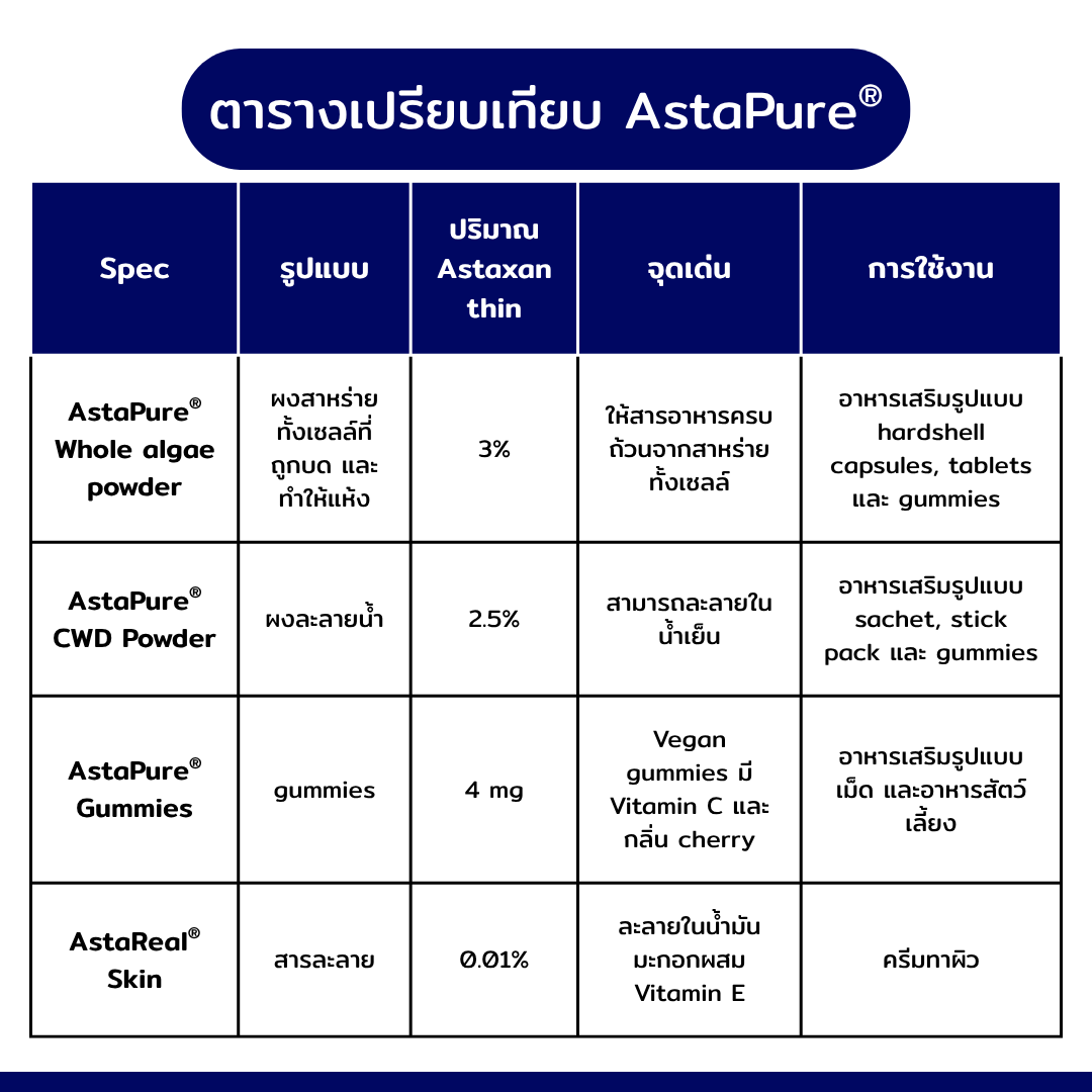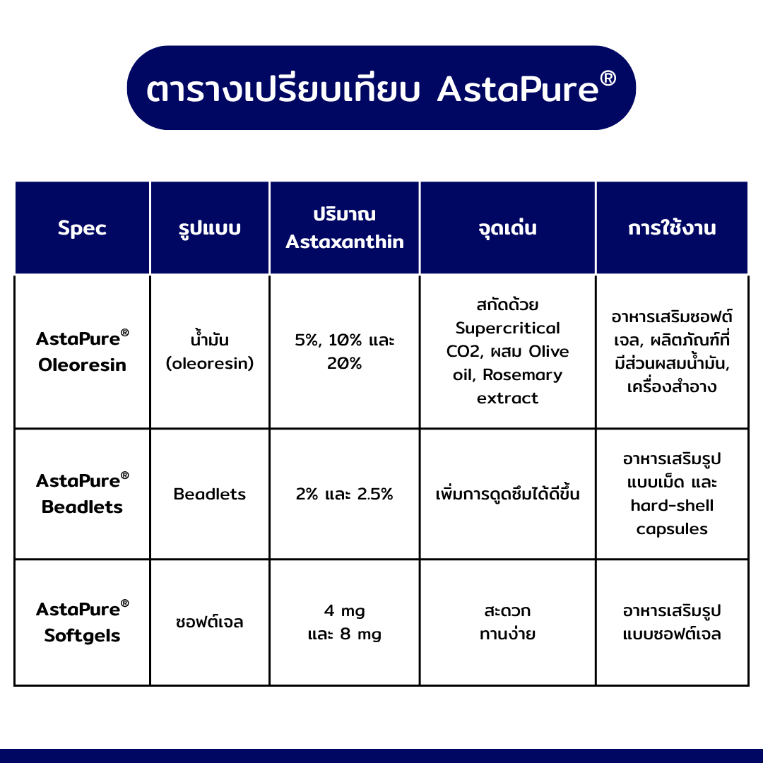 จุดเด่นของ AstaPure® คือ เน้นความยั่งยืน กระบวนการผลิตเป็นมิตรต่อสิ่งแวดล้อม และมีผลิตภัณฑ์หลากหลายรูปแบบ ซึ่ง Spec แต่ละตัวก็ขึ้นอยู่กับปริมาณสารสกัดและการนำไปใช้งาน ส่วนการเปรียบเทียบ AstaPure แต่ละ Spec ที่มีตามท้องตลาดในตอนนี้คือ
