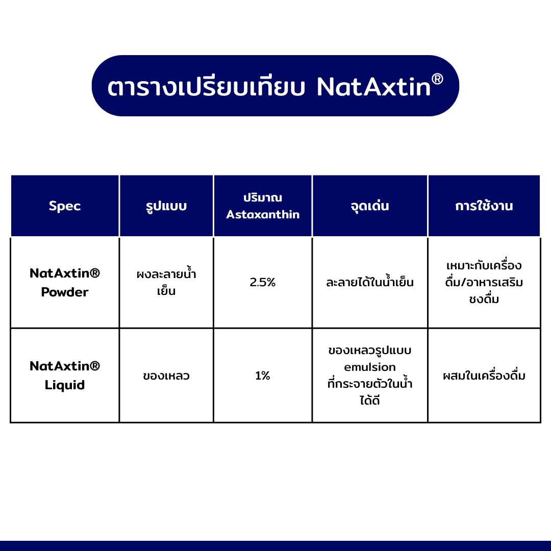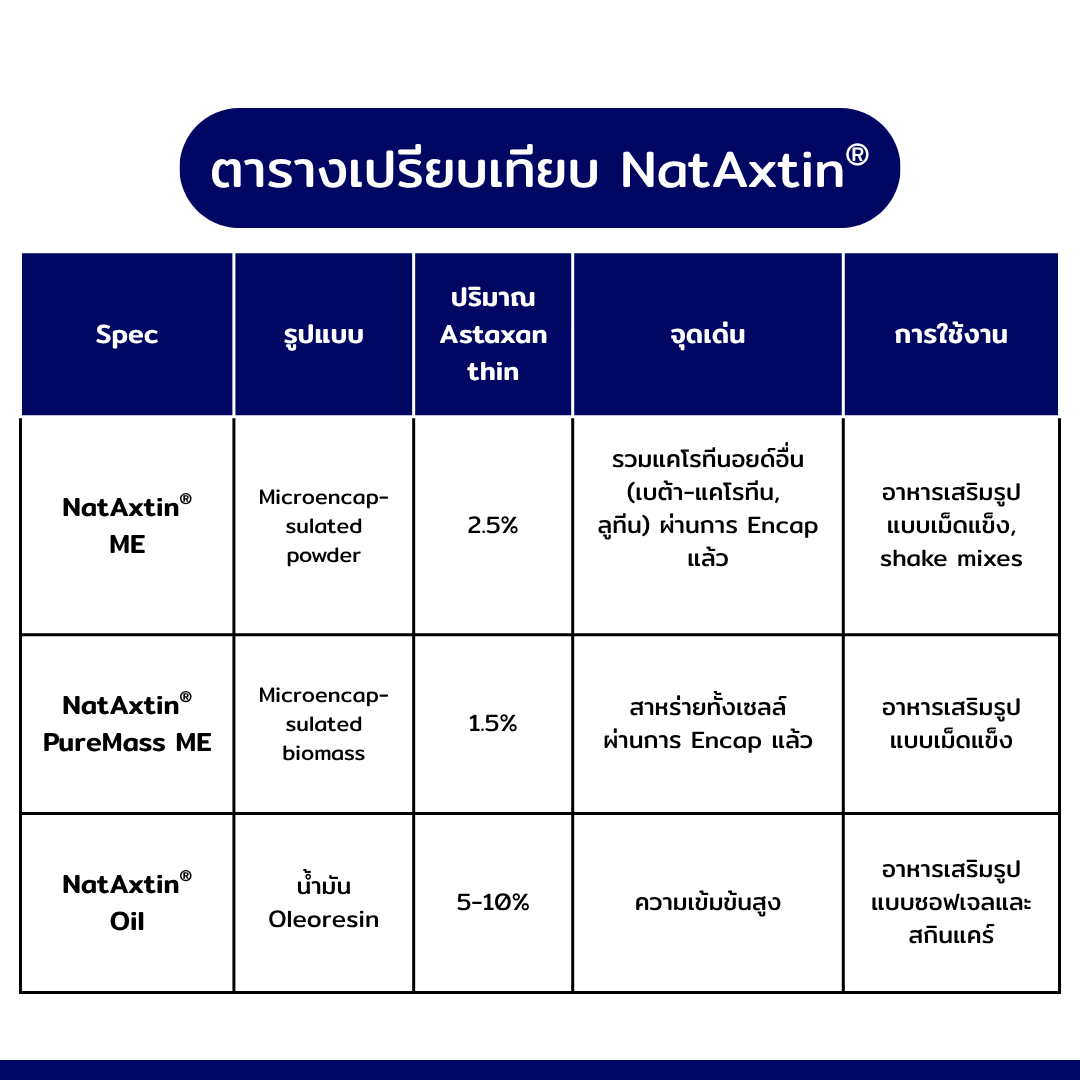 ซึ่ง Spec Astaxanthin แต่ละตัวของ NatAxtin ก็เปรียบเทียบการนำไปใช้งานตามตารางนี้