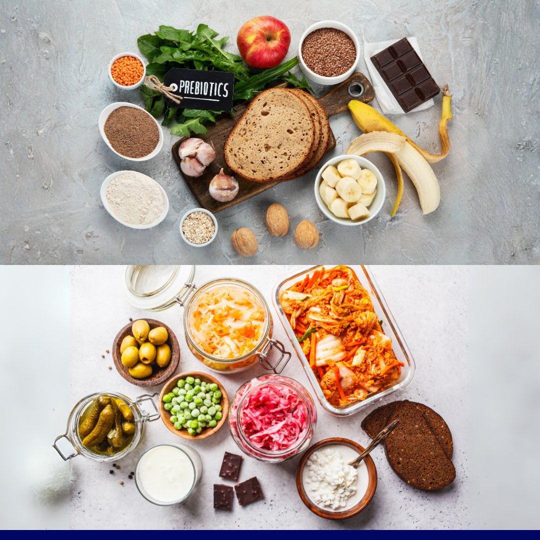 Prebiotic คือ ใยอาหารที่ร่างกายย่อยไม่ได้ แต่เป็นอาหารของโพรไบโอติกในร่างกาย หาได้จากพวกหัวหอม กระเทียม หน่อไม้ฝรั่ง และกล้วย เป็นต้น