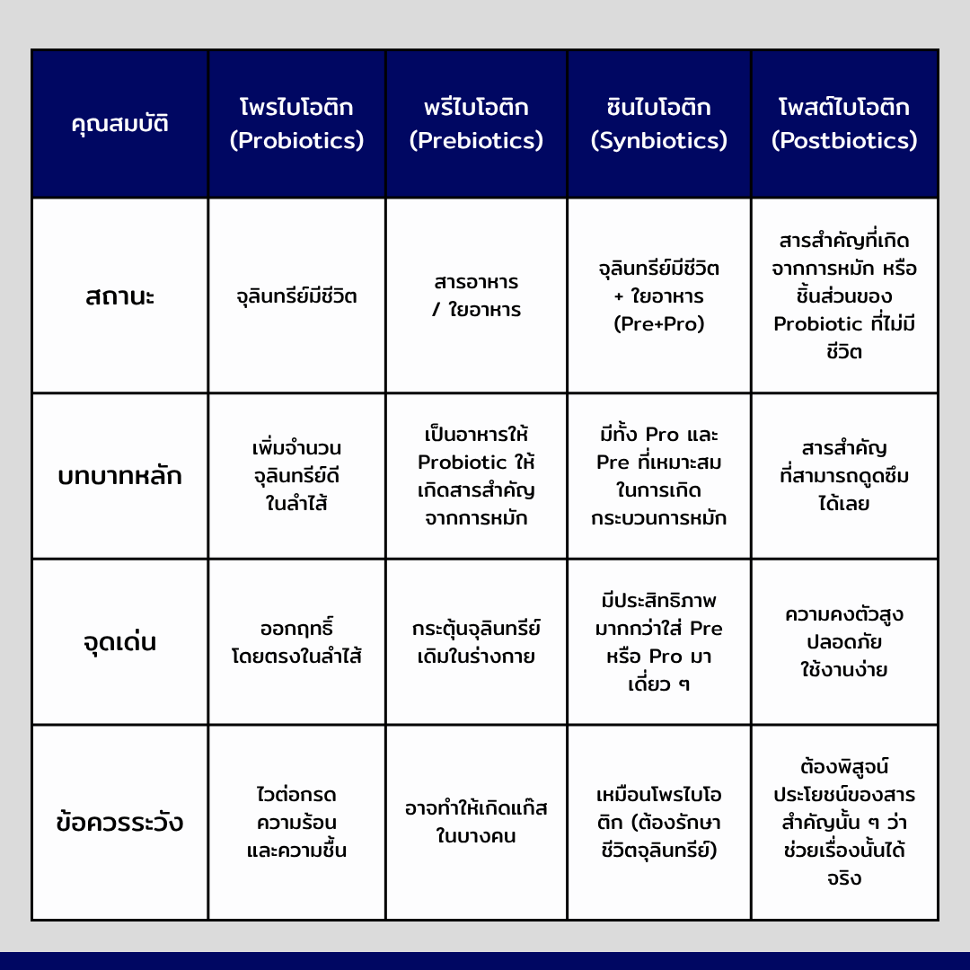 สำหรับผู้ประกอบการ: โพสต์ไบโอติกในไทยยังไม่เห็นว่ามีใส่เข้ามาในอาหารเสริมเเบบตรงๆ เรามักจะเห็นในต่างประเทศ หรือเป็นส่วนผสมในสกินเเคร์มากกว่า ซึ่งในไทยสูตรอาหารเสริมส่วนใหญ่จะเป็นการใส่ Probiotic มาคู่กับ Prebiotic ทางผู้ประกอบการอาจจะต้องทดสอบเพิ่มเติมว่า ควรจับคู่จุลินทรีย์ดีเเละใยอาหารเเบบไหน ถึงทำให้เกิดโพสต์ไบโอติกตามที่ต้องการมากที่สุด