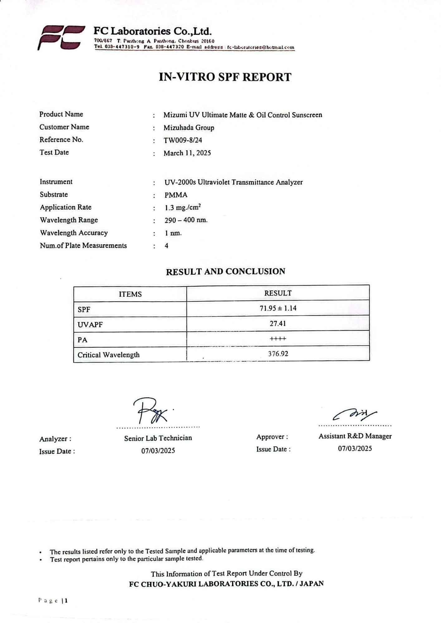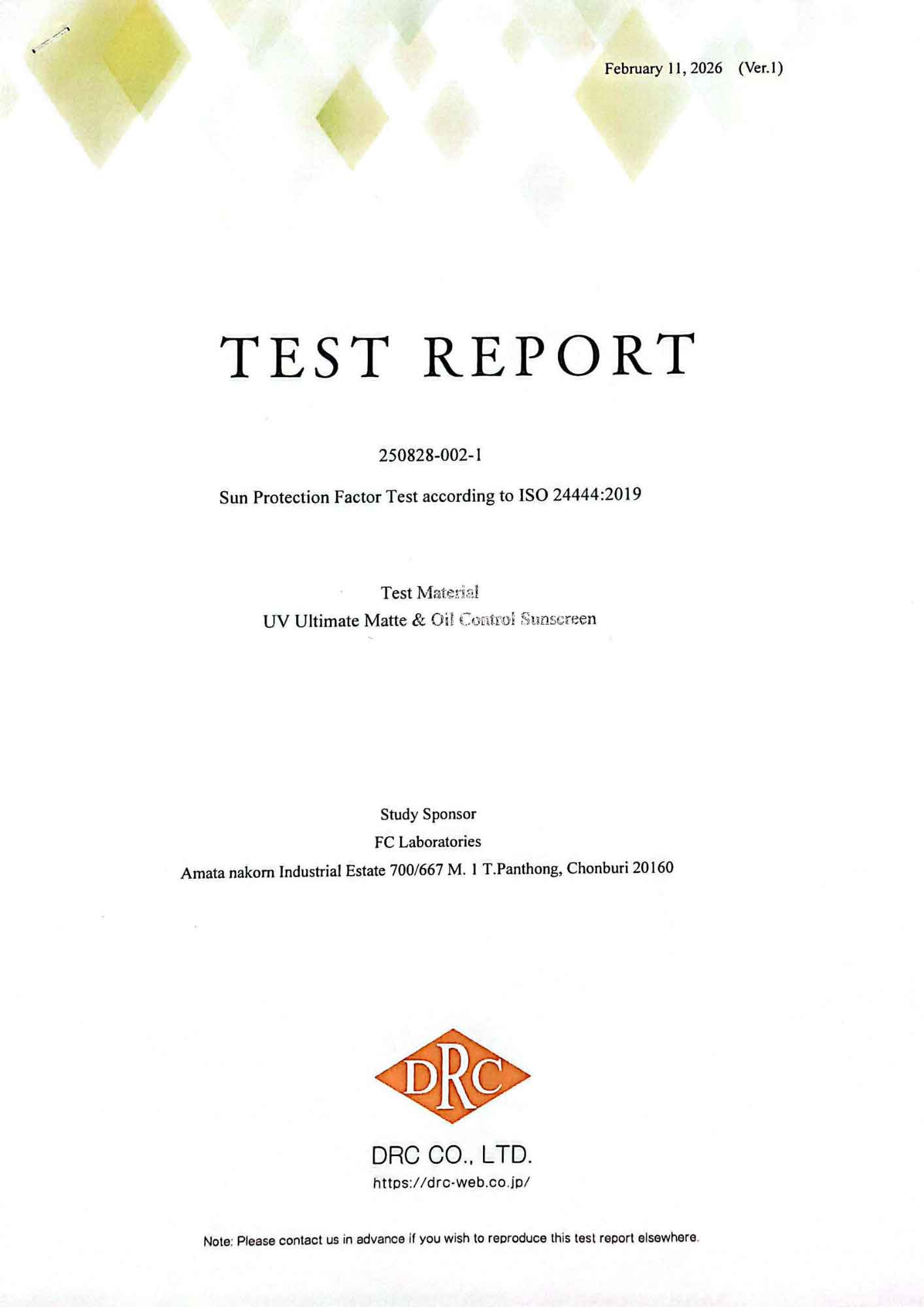 - ISO 24443 (in-vitro) : ค่า SPF เฉลี่ย 56.0 (FC Laboratories: 11/03/25)