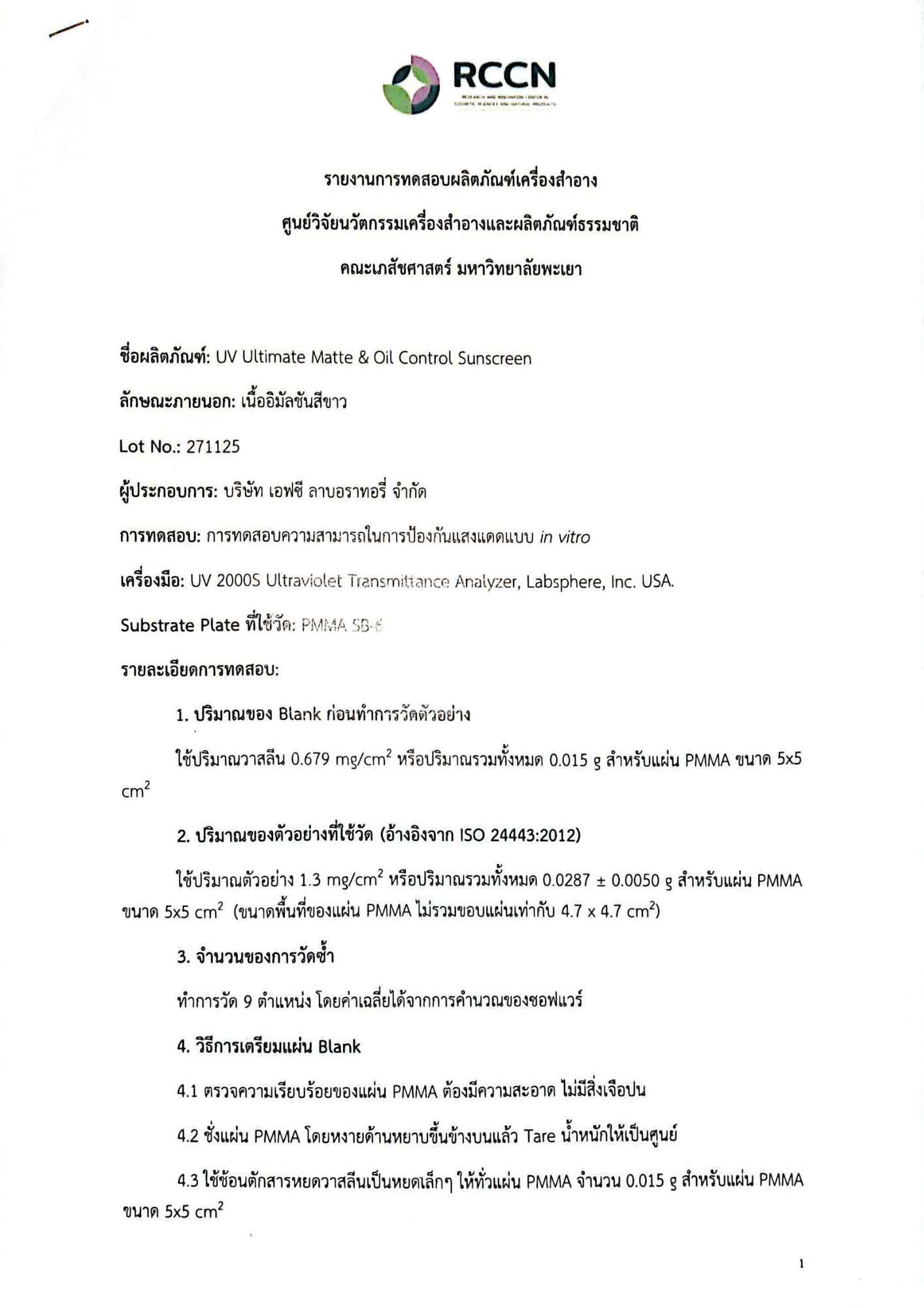 - ISO 24443 (in-vitro) : ค่า UVAPF เฉลี่ย 27.41/PA++++ (FC Laboratories: 11/03/25)