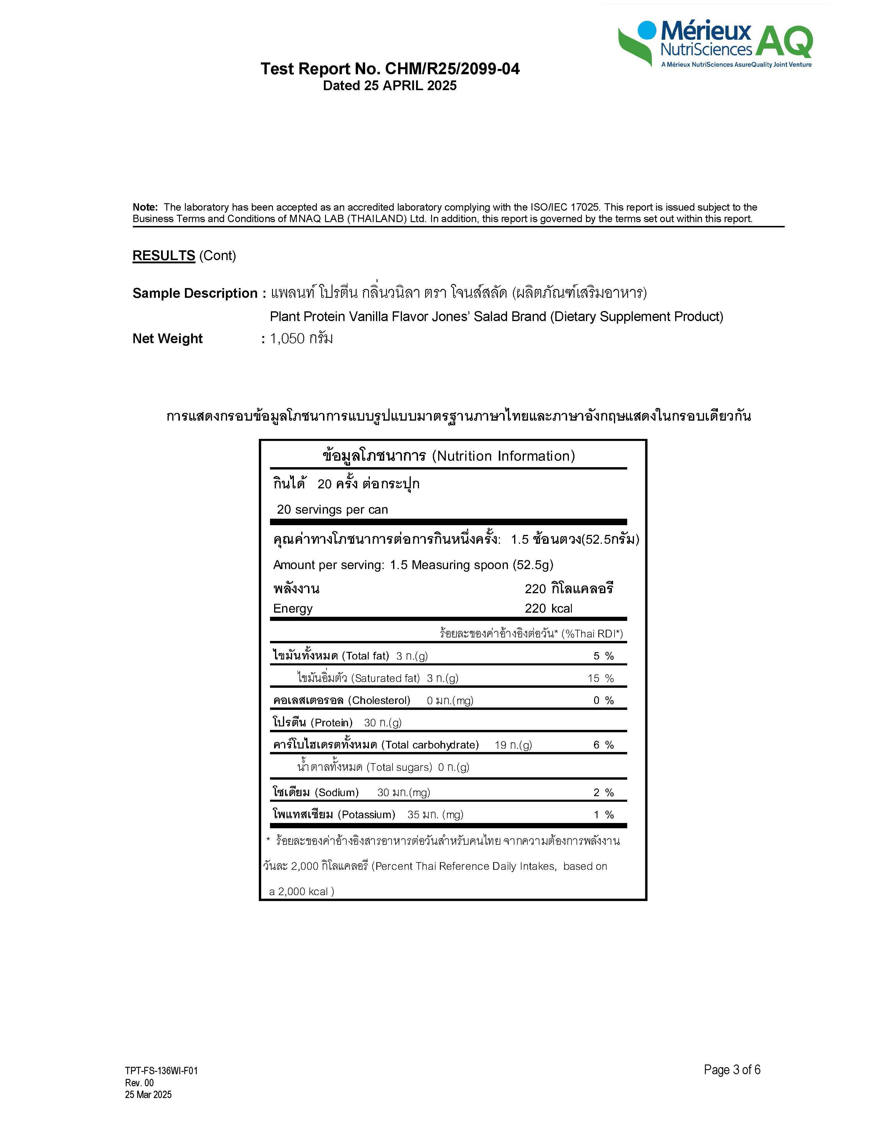 - พลังงาน 220 kcal/1.5 ช้อนตวง/Serving
