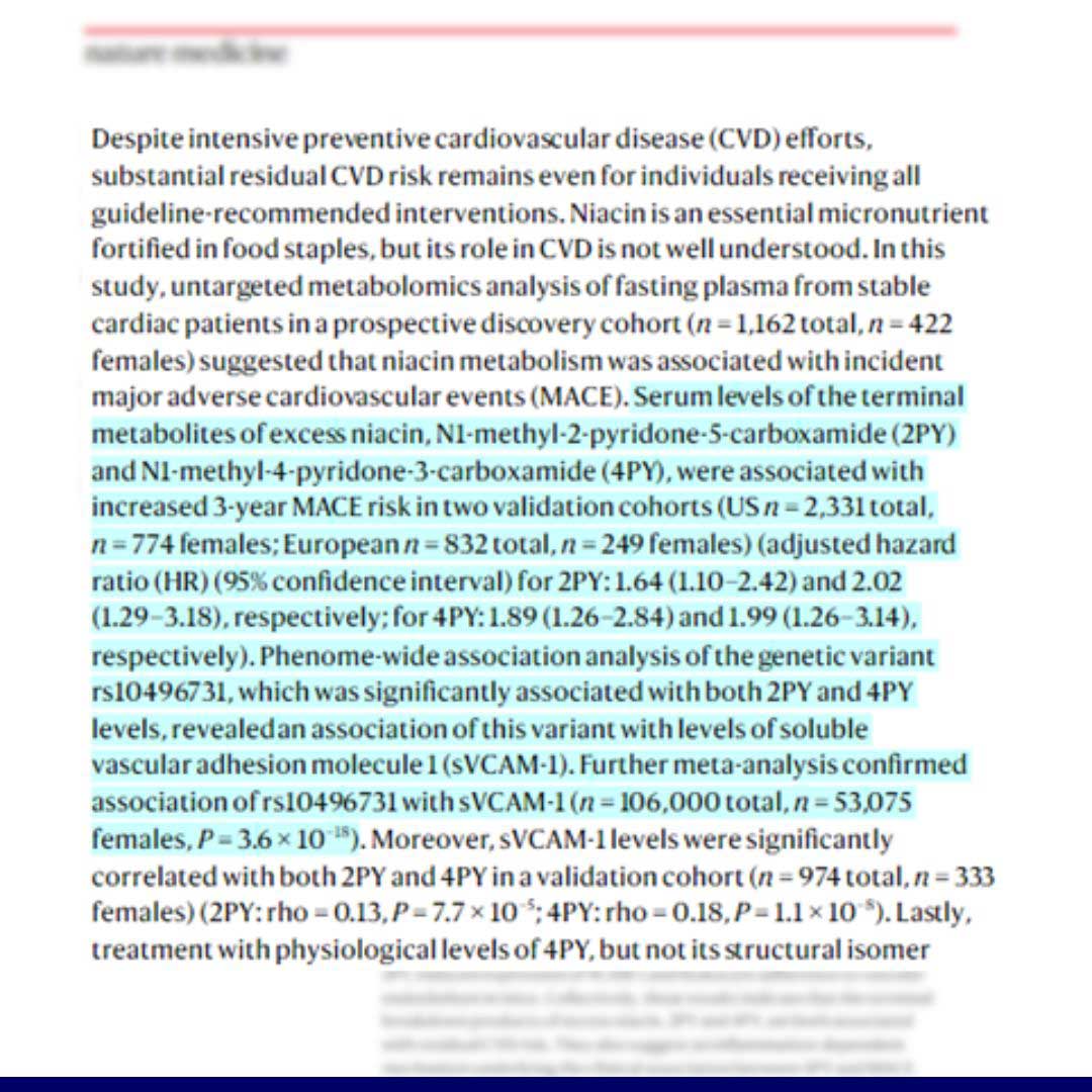 ตัวแปรที่สำคัญคือ 2PY กับ 4PY ซึ่งเป็น NIACIN METABOLITE ซึ่งจะเกิดขึ้นก็ต่อเมื่อร่างกายได้รับ VITAMIN B3 ที่มากเกินไป โดยโดสสูงสุดของปริมาณ NIACIN ที่ต้องกินคือ 35 mg/วัน เท่านั้นเอง ซึ่งถ้ากินเกินโดสนี้ แน่นอนว่าต้องมีผลเสียต่อร่างกายอยู่แล้วค่ะ (อ้างอิง)