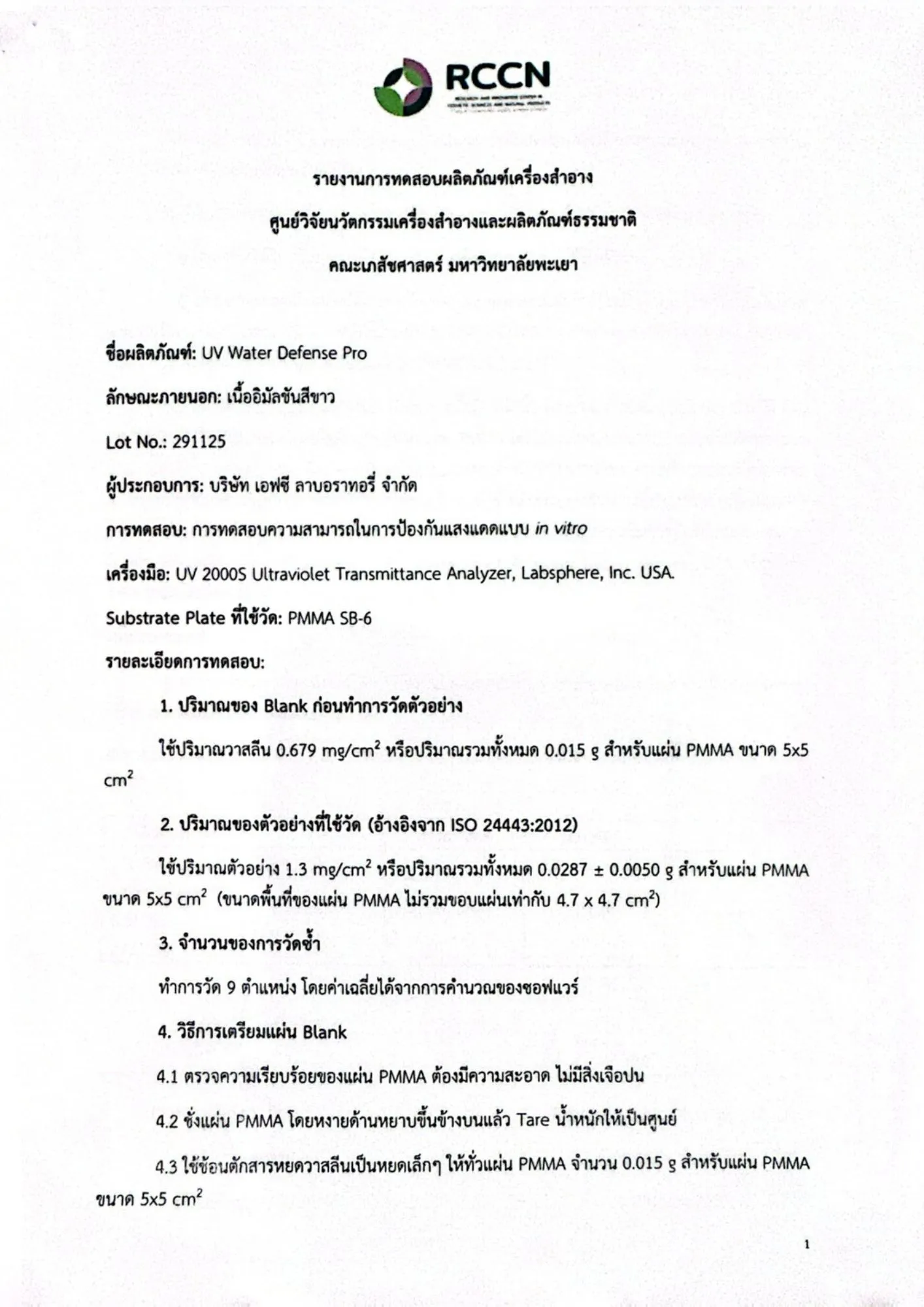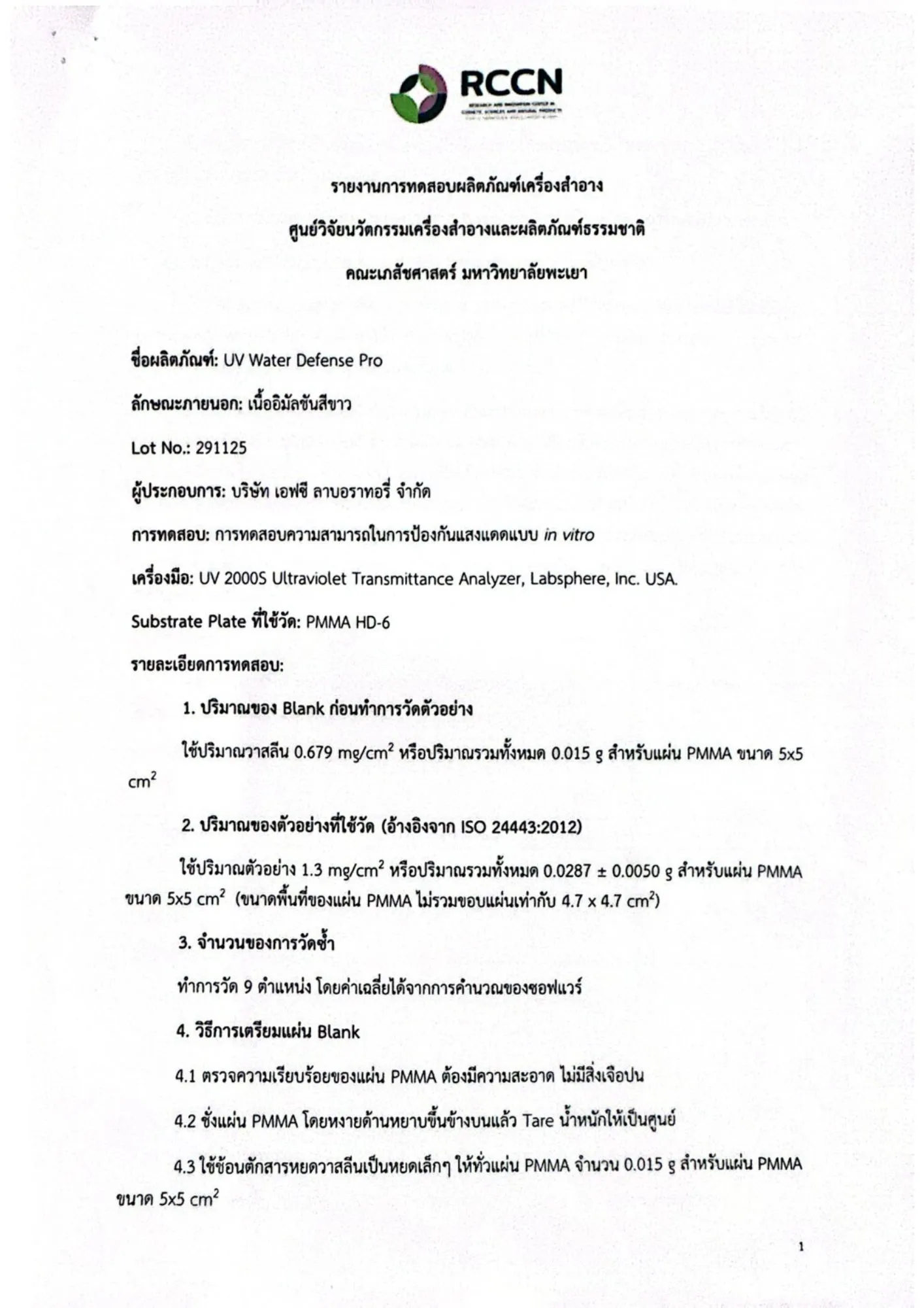 - in-vitro test : ค่า UAPF เฉลี่ย 24.96 / PA++++ (RCCN มหาวิทยาลัยพะเยา 19/01/2026)